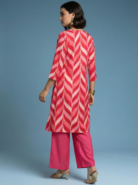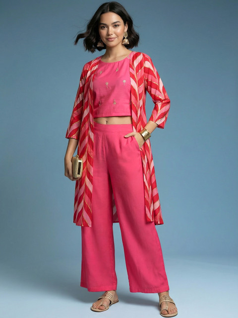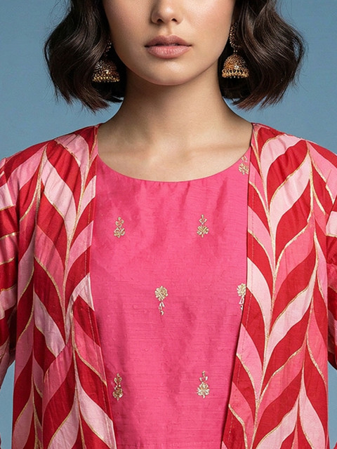 Pink & red embroidered top & printed shrug, has a round-neck and three-quarter sleeves, secured with slip-on closure