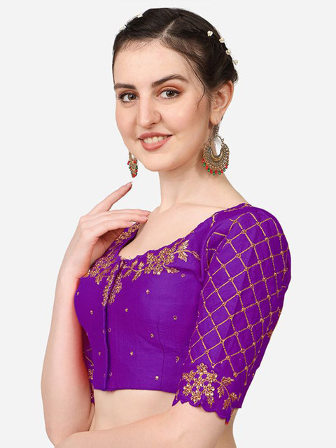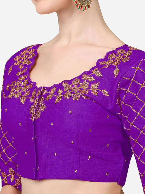 Purple embroidered blouse with sequin and thread detail, has a round neck, short sleeves and hook and eye closure with tie-up details