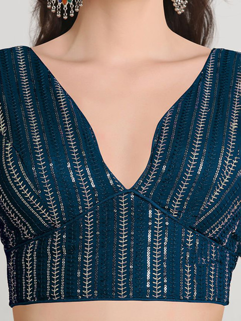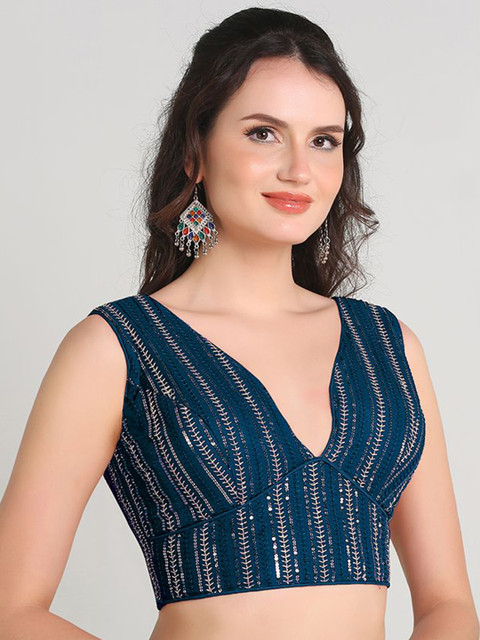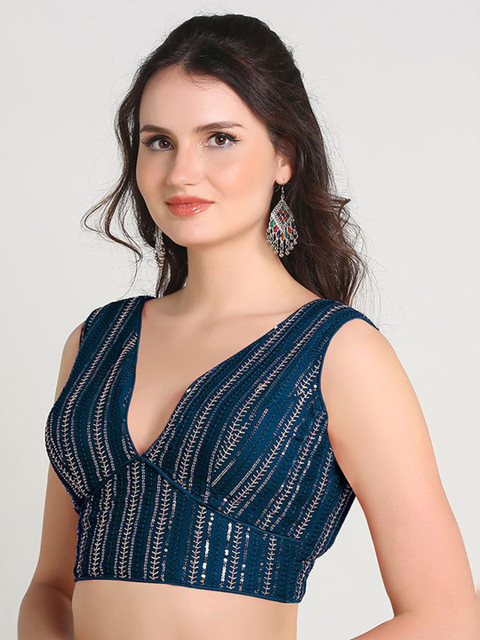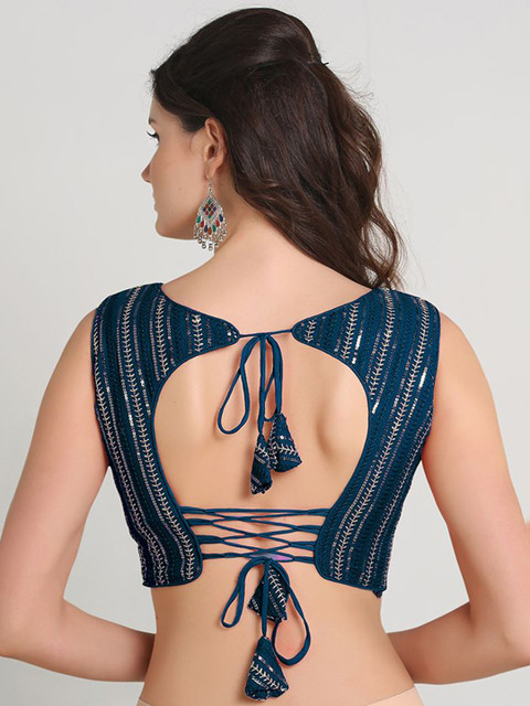 Teal blue Embroidered saree blouse has a V neck, sleeveless, padded Back Open String dhori closures
