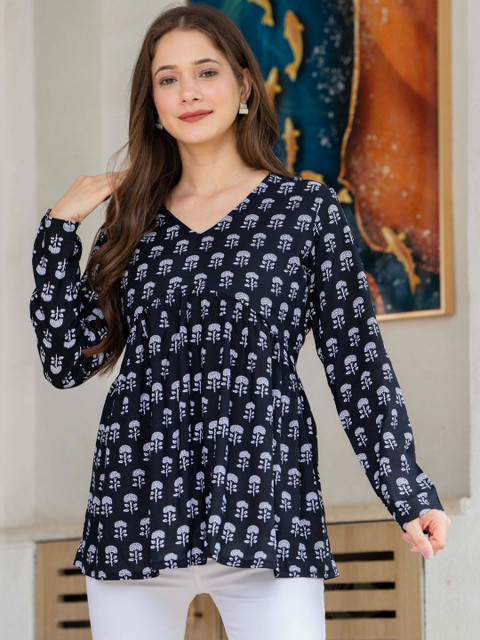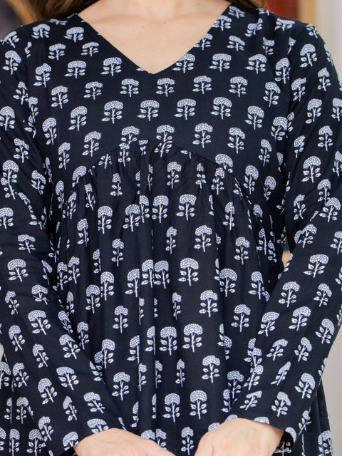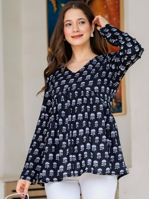 HERE&NOW Ethnic Motifs Printed V-Neck Pure Cotton Empire Kurti