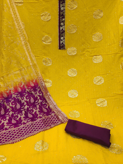 Yellow and purple and gold-toned woven design unstitched dress material, has sequinned detail