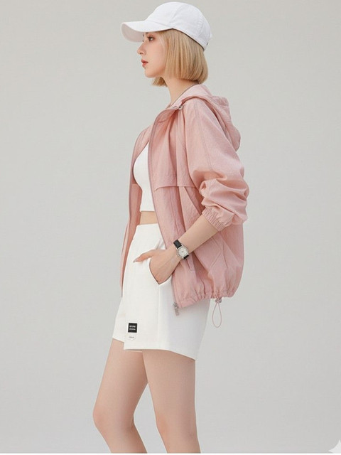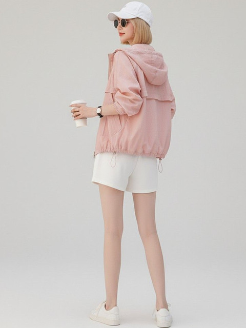 Pink solid tailored jacket with patchwork, has a hood ,has a zip closure, long sleeves, curved hemline, nylon lining