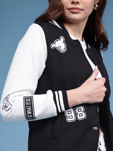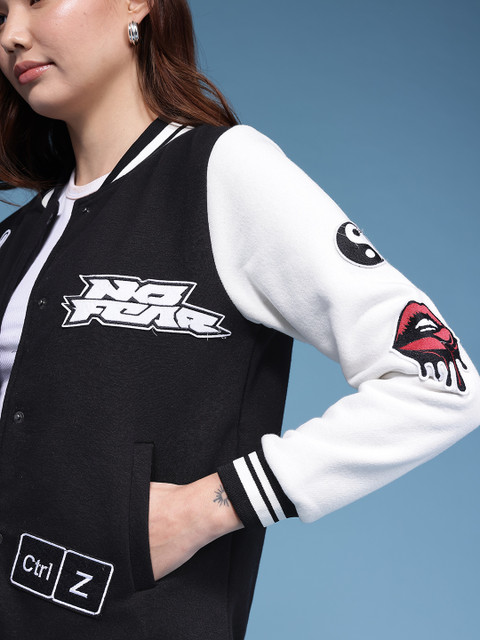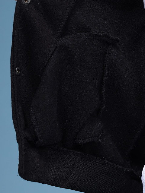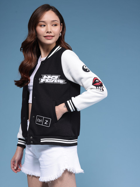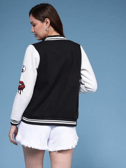 Black and white varsity jacket, has a stand collar, 2 pockets, has a snap button closure, long sleeves, straight hemline, without lining