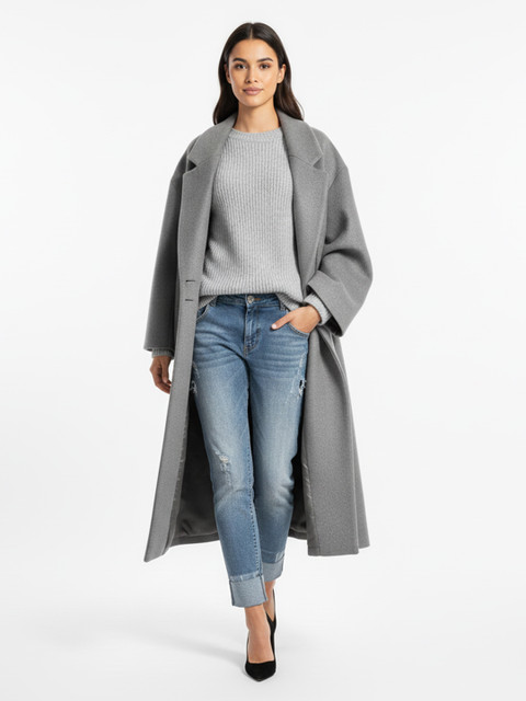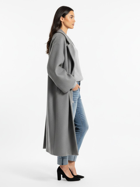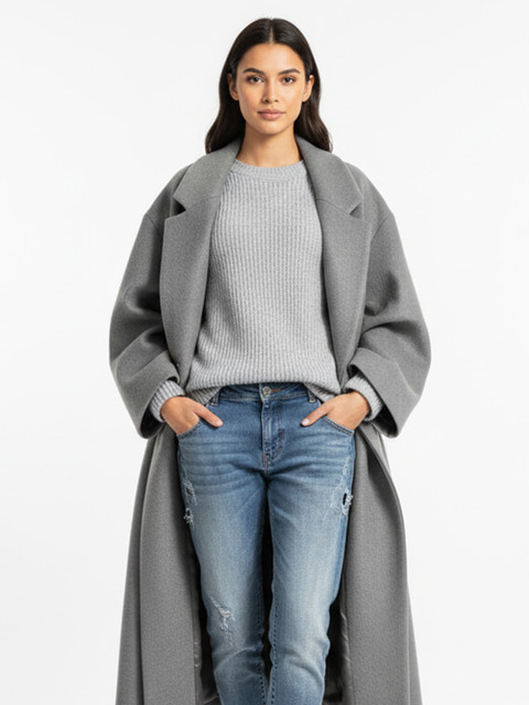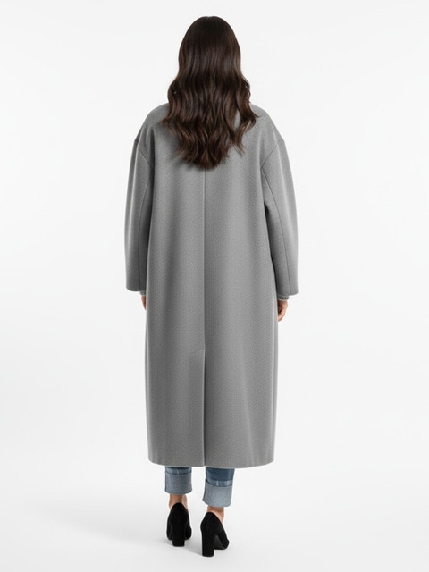 Grey solid single-breasted longline trenchcoat, has notched lapel collar, long sleeves, button closure, two pockets, a straight hem