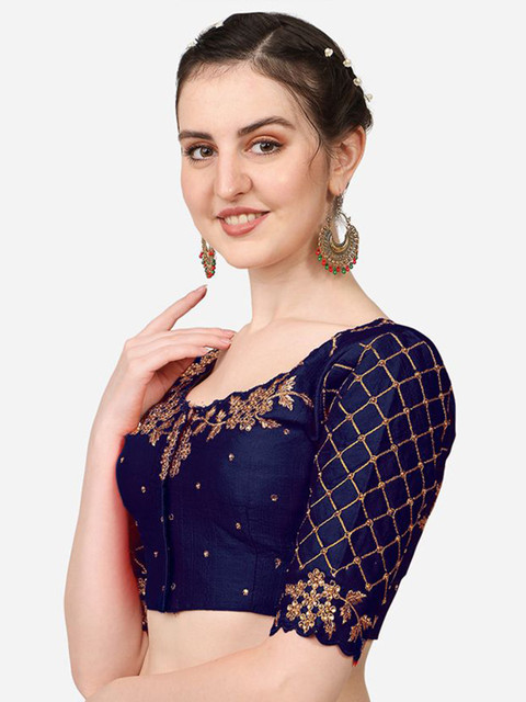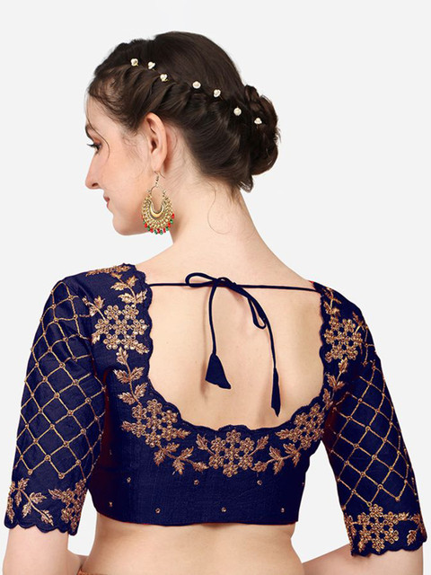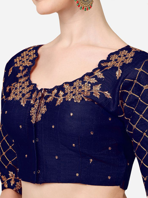Navy blue embroidered embellished readymade blouse, has a round neck, short sleeves & hook & eye closure at the front