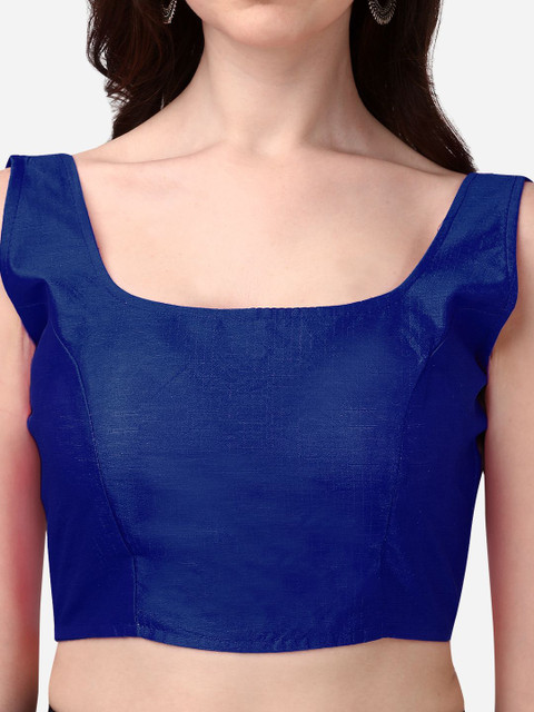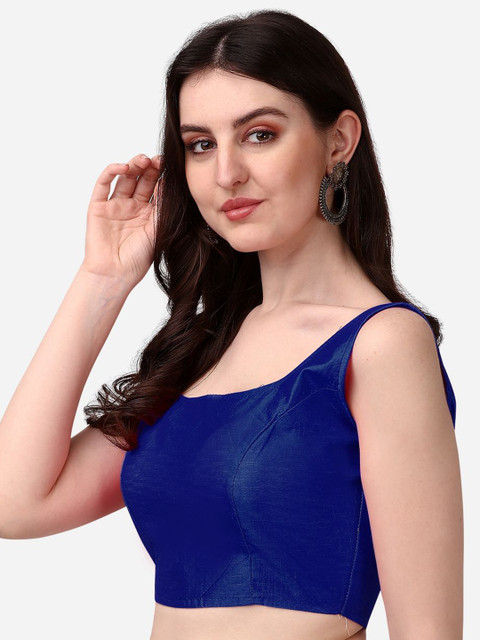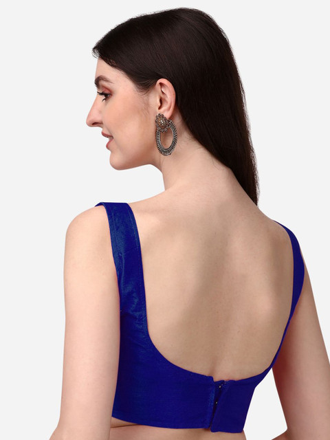 Navy blue solid padded blouse has a round neck, sleeveless, and hook and eye closure