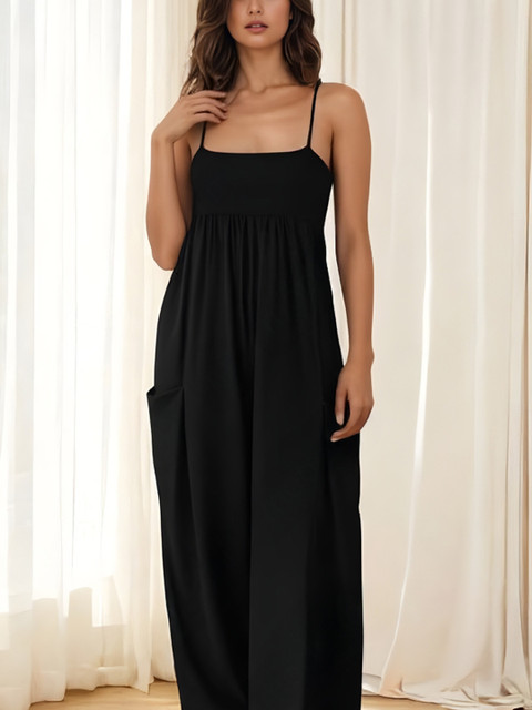 Black solid playsuit ,has a shoulder straps, sleeveless, 2 pockets