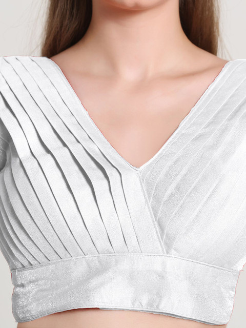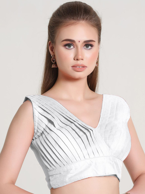 White solid padded blouse, has a V-neck, sleeveless and back hook and eye closure with tie-up details