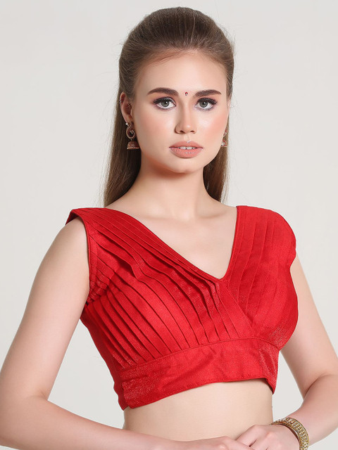 Red solid padded blouse, has a V-neck, sleeveless and back hook and eye closure with tie-up details