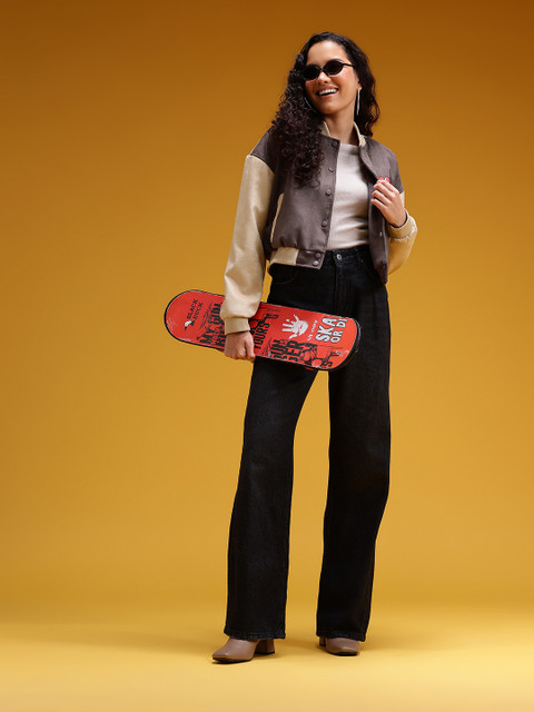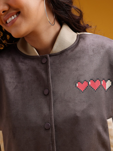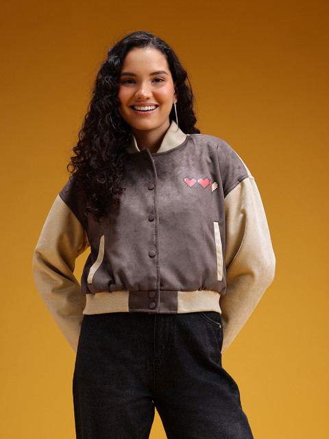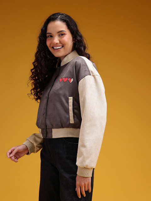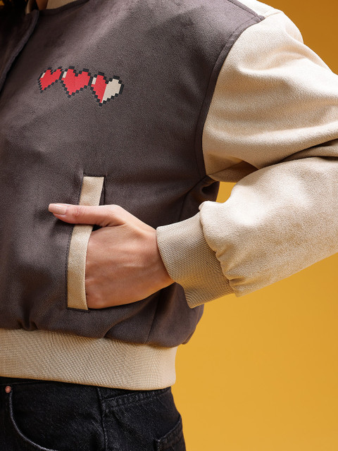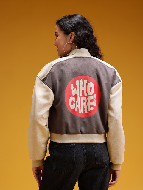 Beige typography printed bomber, has a stand collar, 2 pockets ,has a zip closure, long sleeves, straight hemline, polyester lining