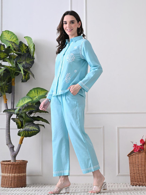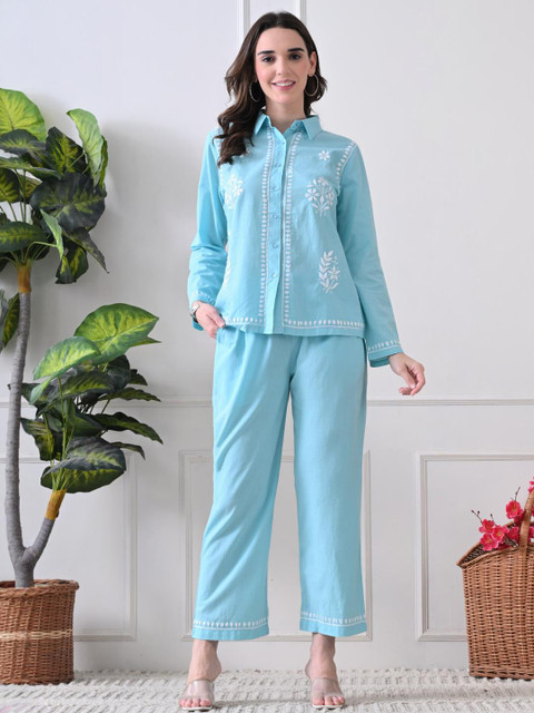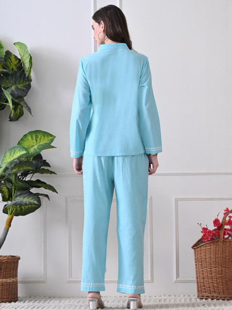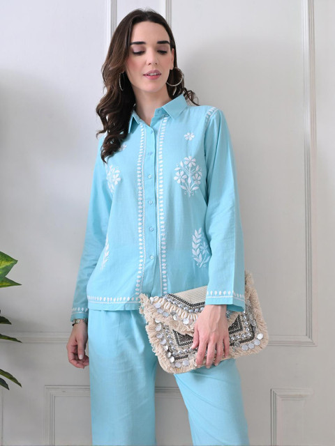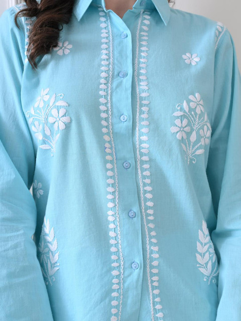 Blue embroidered tunic, has a shirt collar and long sleeves, secured with button closure and flared waist hem