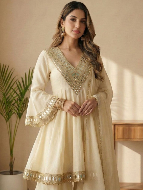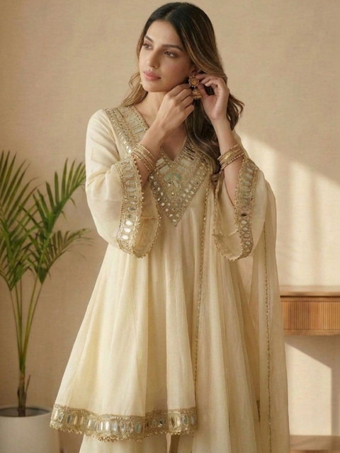 Elevate your ethnic wardrobe with this embroidered silk kurta set with dupatta, designed to make every festive moment special. The rich silk fabric adds a natural sheen and graceful fall, while the delicate embroidery enhances its traditional charm. Style it with statement jhumkas, embellished mojaris, and a sleek clutch for weddings or festive gatherings. For a refined daytime look, opt for minimal makeup and soft waves to let the luxurious silk texture shine effortlessly.