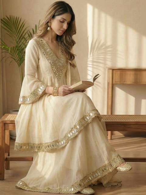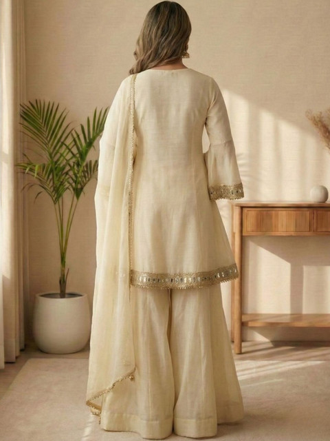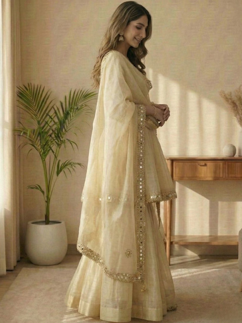 Cream-coloured Embroidered Kurta with Sharara With Dupatta
