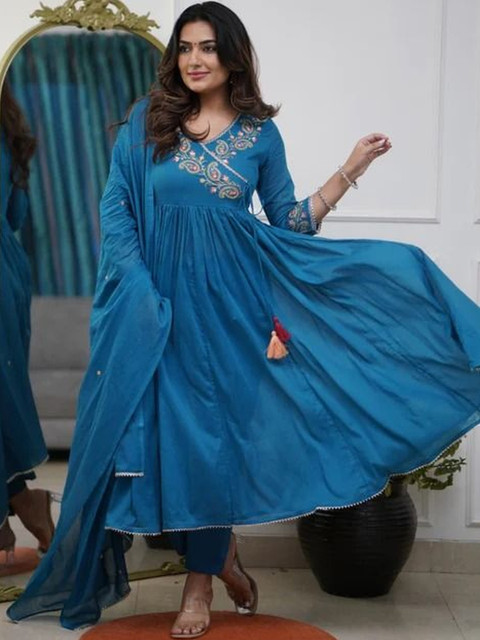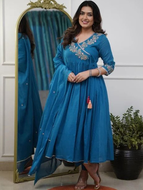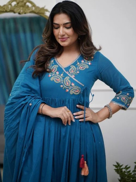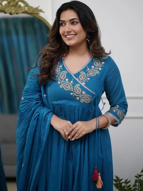 3 reviews for HERE&NOW Women Floral Embroidered Angrakha Thread Work Chanderi Silk Kurta with Trousers & With Dupatta