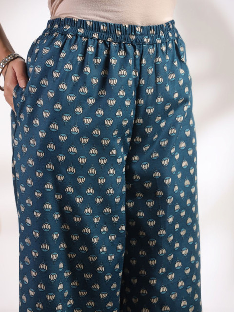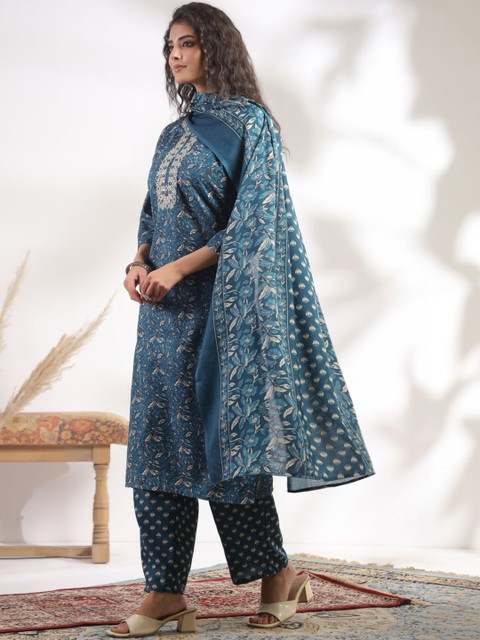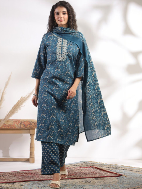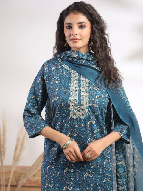 HERE&NOW Women Floral Printed Regular Thread Work Pure Cotton Kurta with Palazzos & With Dupatta