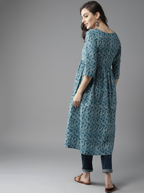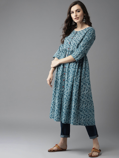 Teal blue and white printed A-line kurta, has a round neck, three-quarter sleeves, flared hem, front slit, full button placket