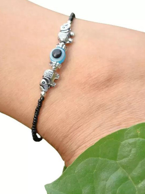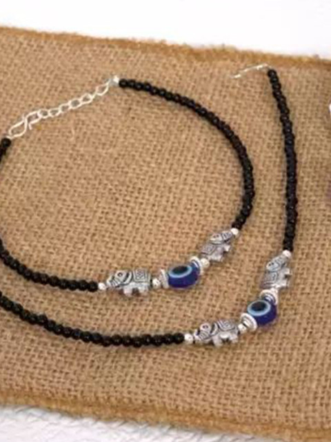 Silver toned , black and blue artificial beaded anklet , Silver-plated