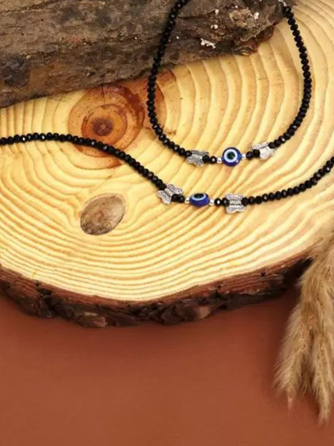 Silver toned ,blue and black artificial beaded anklet, silver-plated
