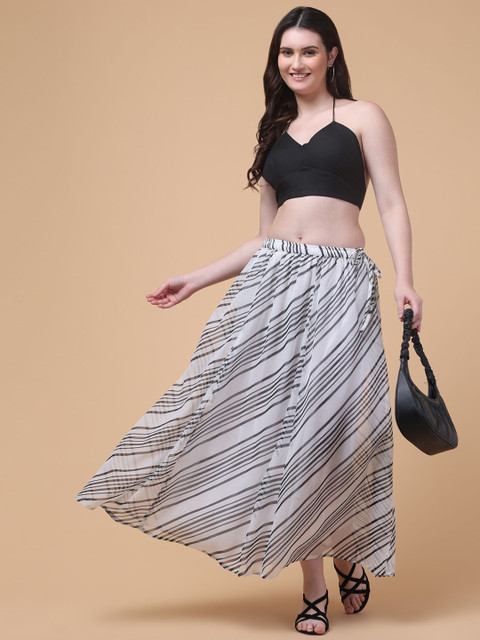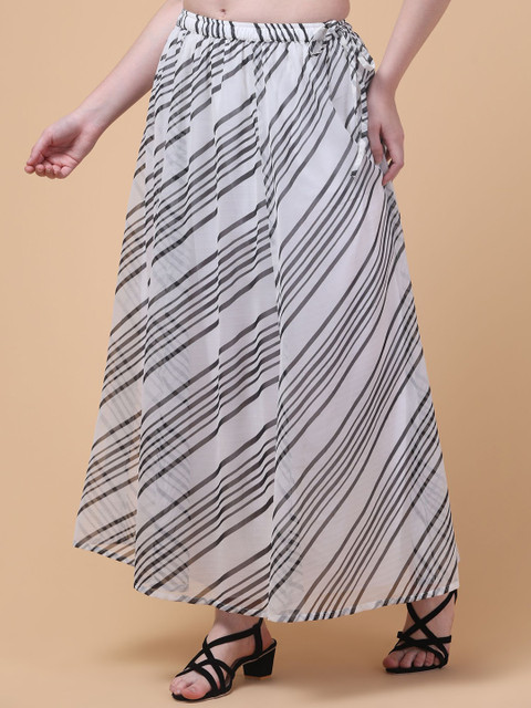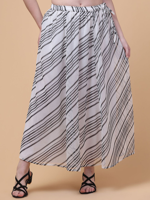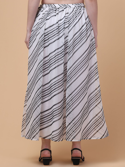 White striped flared maxi skirt, has an elasticated waistband with slip-on closure, and a flared hem