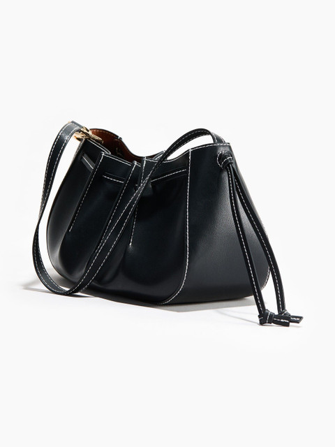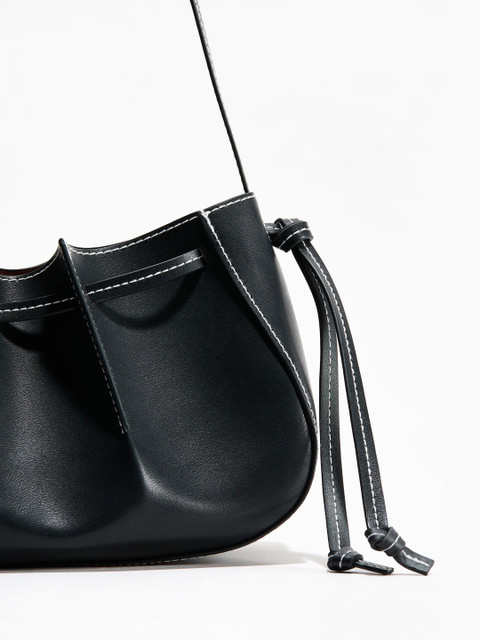 Shoulder bag in coated fabric with sewn-in pleats and a drawstring around the top. Long handle with a metal clasp at one end.