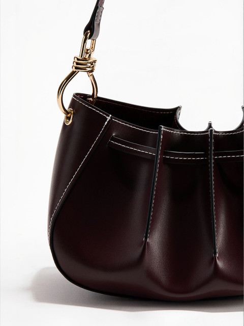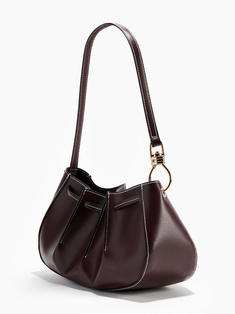 Shoulder bag in coated fabric with sewn-in pleats and a drawstring around the top. Long handle with a metal clasp at one end.