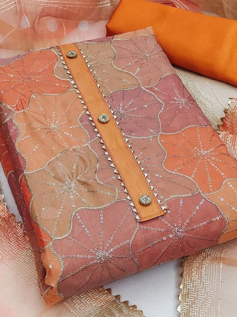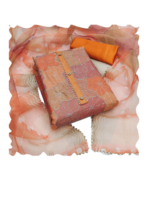 Orange, gold-toned and pink embroidered unstitched dress material