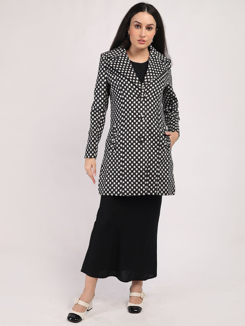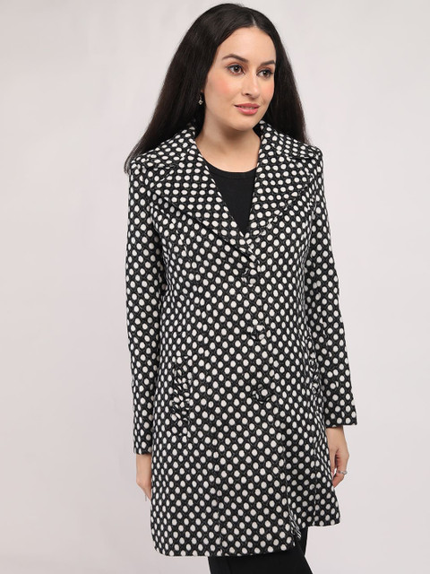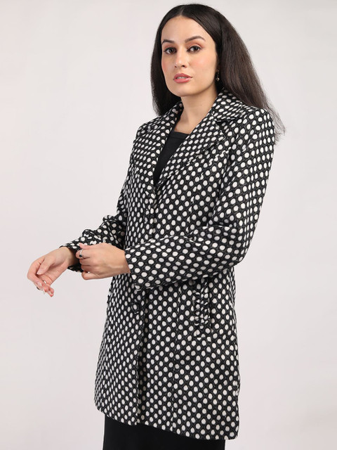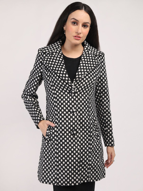 Black & white polka dot printed regular-fit single-breasted hip-length overcoat, has notched lapel collar, long sleeves, button closure, two pockets, a straight hem