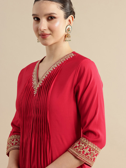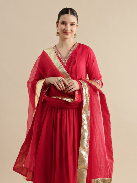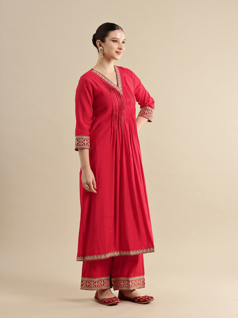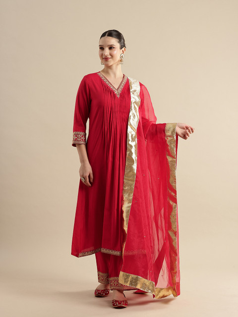 Red ethnic motifs embroidered kurta with trousers and dupatta
