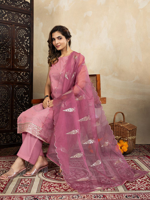 This kurta set consists pink and gold toned of kurta, trousers and dupatta