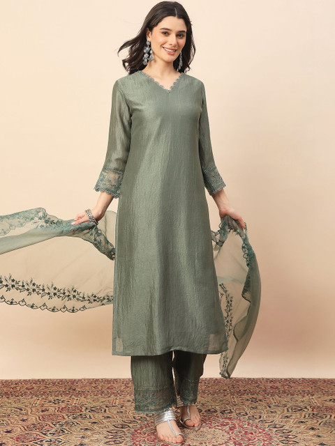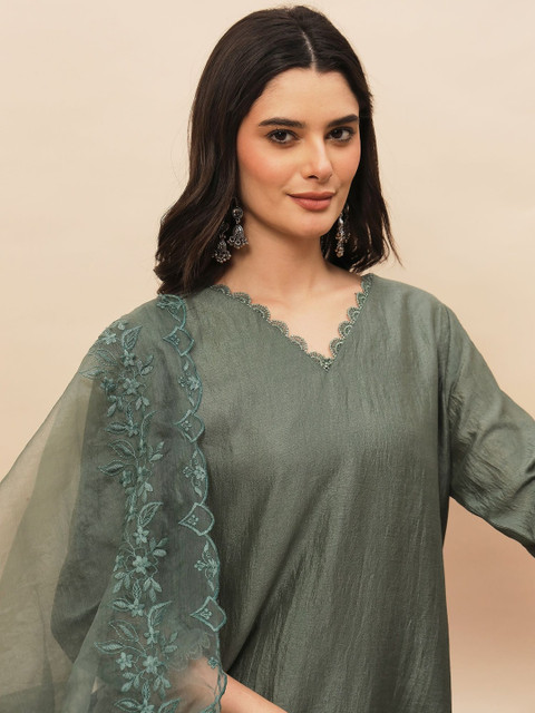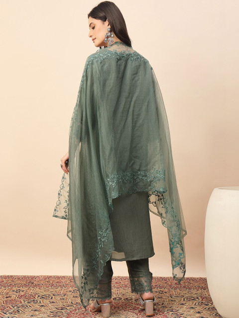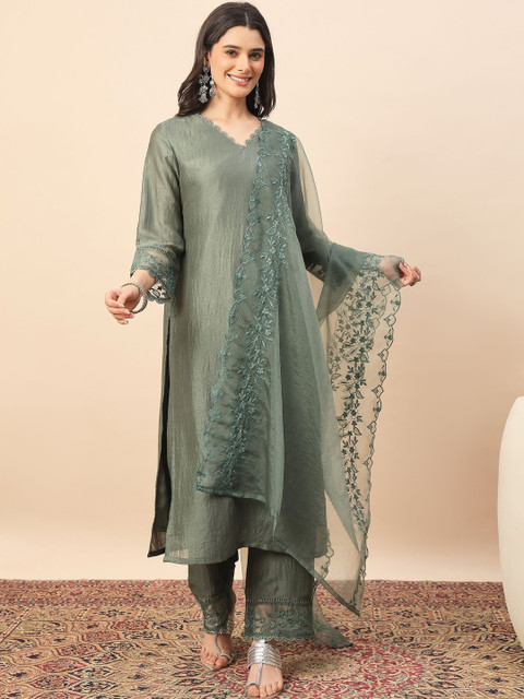 This kurta set consists of kurta and trousers with dupatta