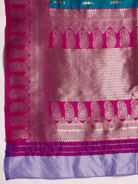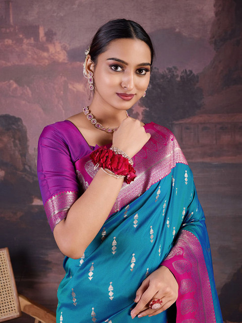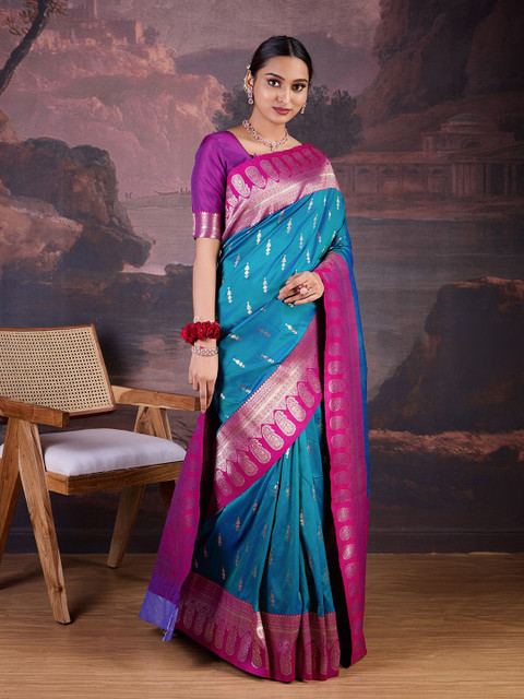 “I recently purchased a blue and pink Kanjeevaram saree, and I’m blown away by the craftsmanship. The contrast between the deep blue and soft pink hues is striking, and the gold zari work is exquisite. The saree is made from high-quality silk, which drapes beautifully and feels luxurious against the skin. I’ve worn it to a few events already, and the feedback has been amazing. If you’re looking for a traditional yet stylish saree, this one’s a must-have!”