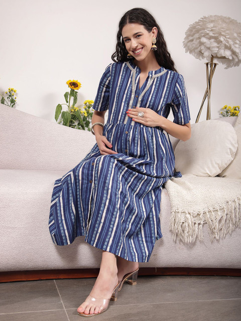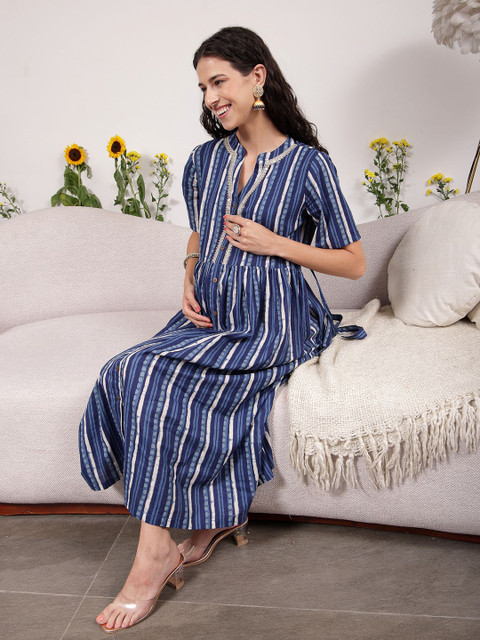 House Of Zelena Festive Cotton Maternity Zipless Feeding Dress with Lapel Metallic Lace