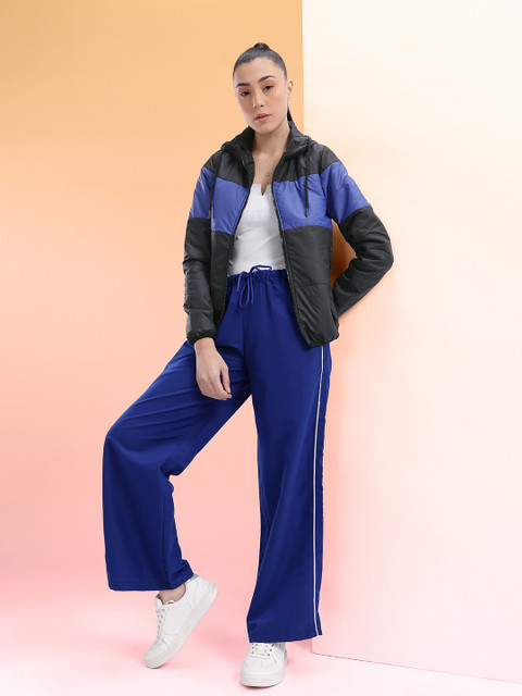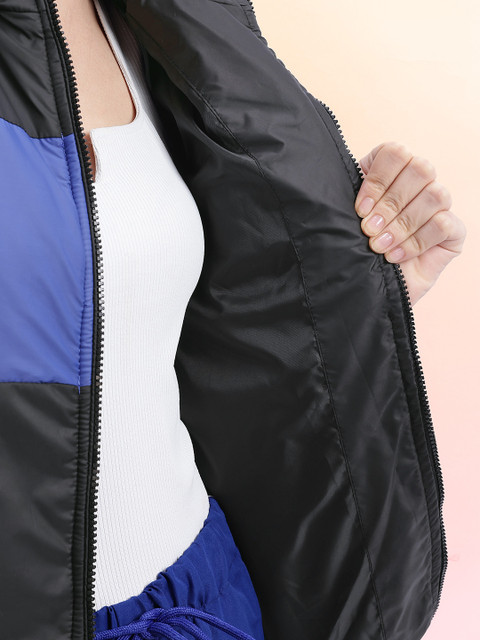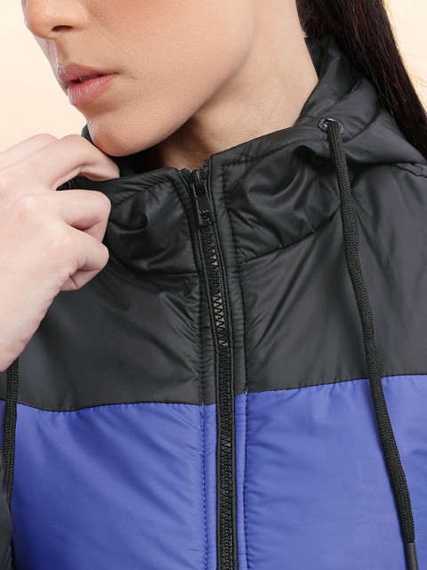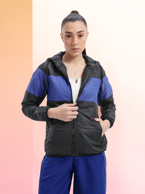 Black and Blue colourblocked tailored jacket, has a hooded neck, 2 pockets, has a zip closure, long sleeves, straight hemline, without lining