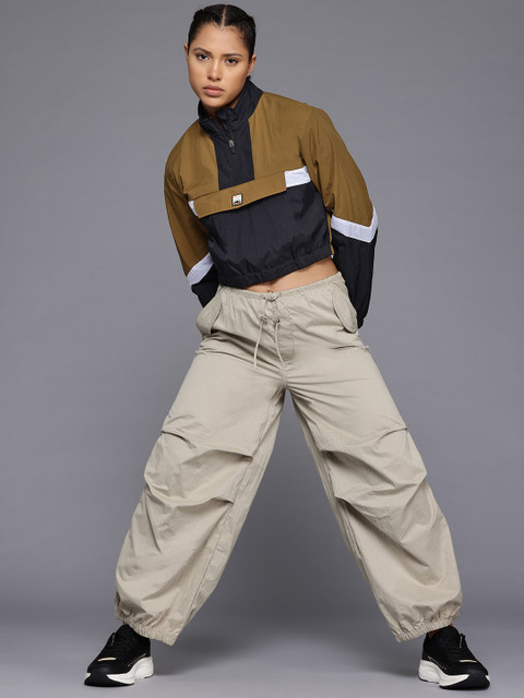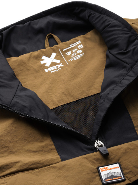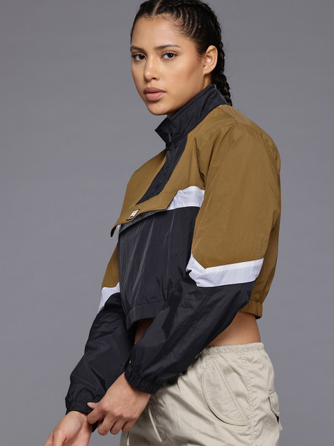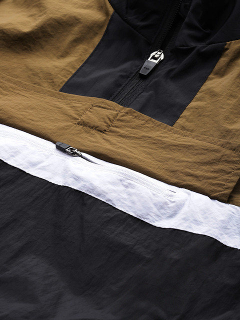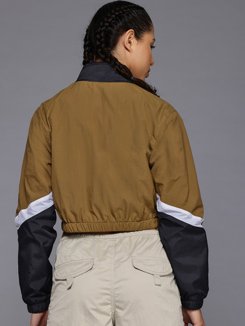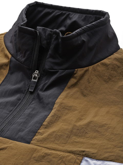 Brown colourblocked tailored jacket, has a mock collar, 2 pockets ,has a zip closure, long sleeves, straight hemline, without lining engineered with no