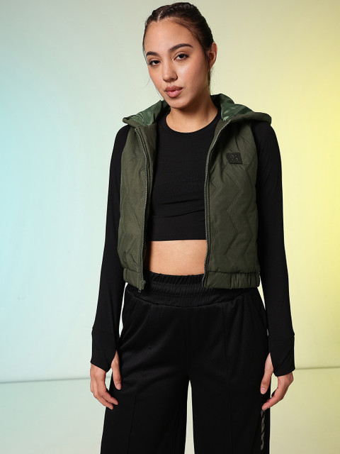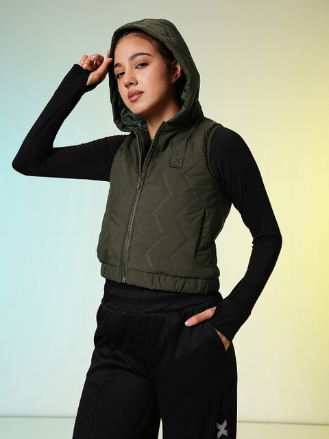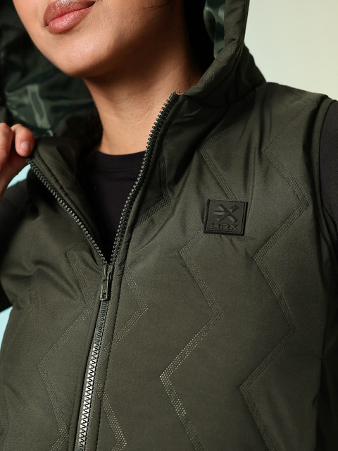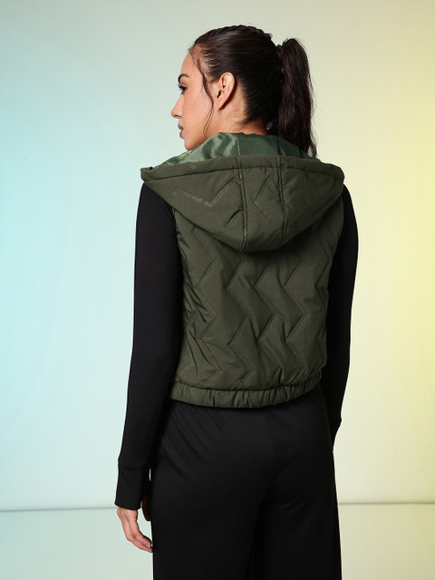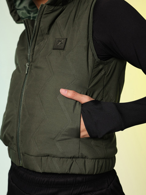 Olive green solid padded running jacket, has a hood, 2 pockets, has a zip closure, sleeveless, straight hemline, polyester lining