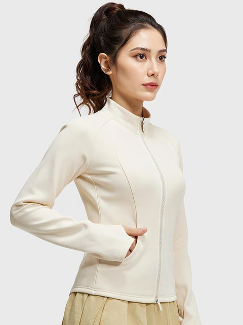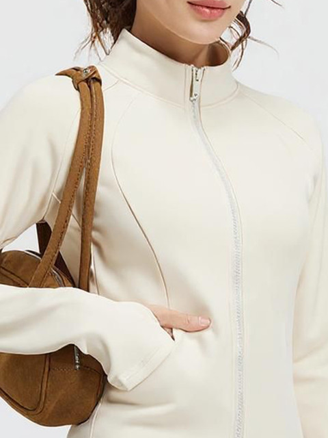 Cream solid bomber with zip detail, has a mandarin collar, na pockets ,has a button closure, long sleeves, curved hemline, nylon lining