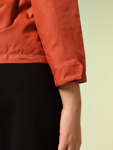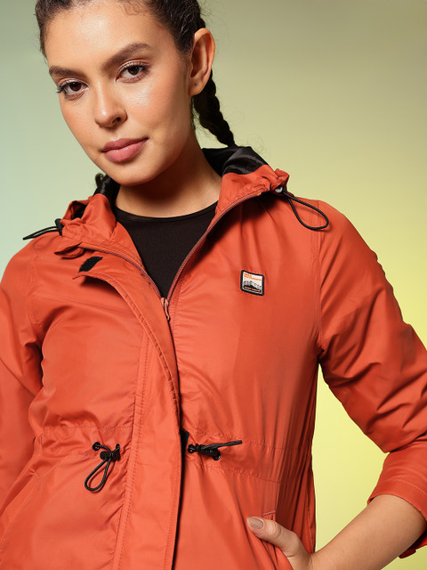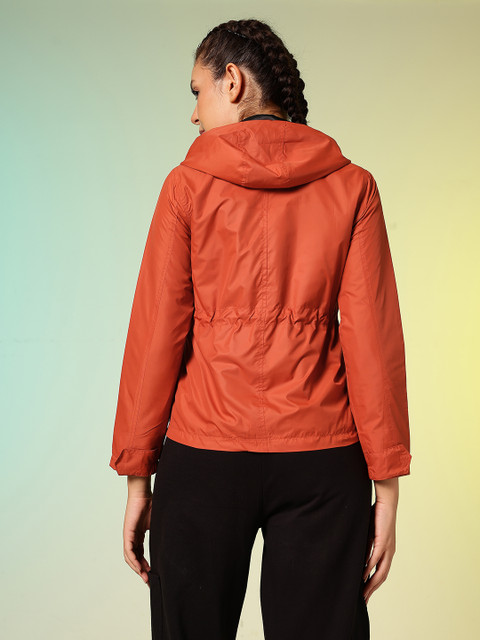 Red solid sporty jacket, has a hooded, 2 pockets, has a zip closure, long sleeves, straight hemline, polyester lining