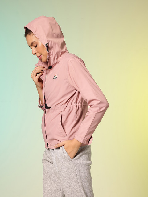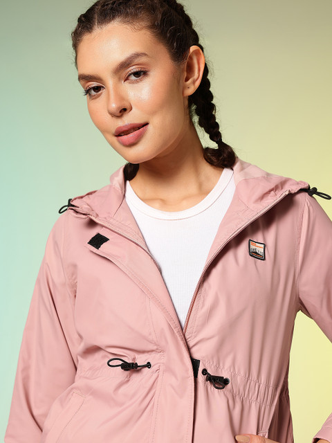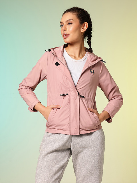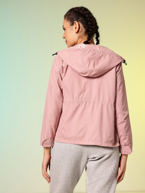 Pink solid tailored jacket, has a hooded, 2 pockets, has a zip closure, long sleeves, straight hemline, polyester lining