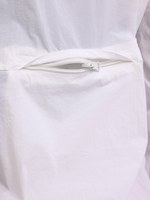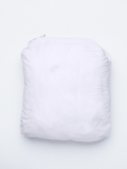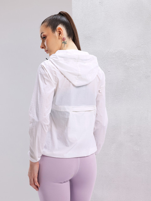 White solid running jacket, has a hood, long sleeves, zip closure, 2 pockets, and regular length