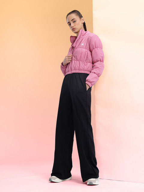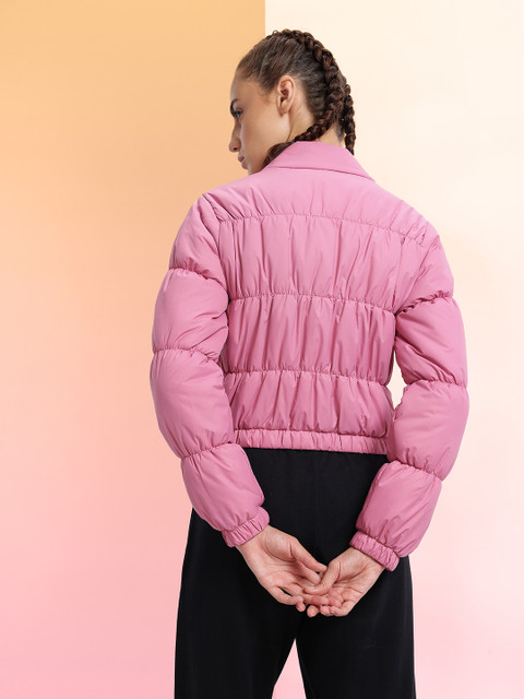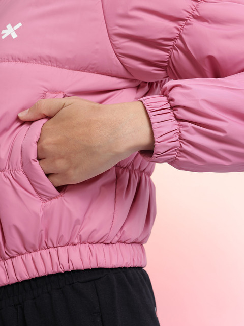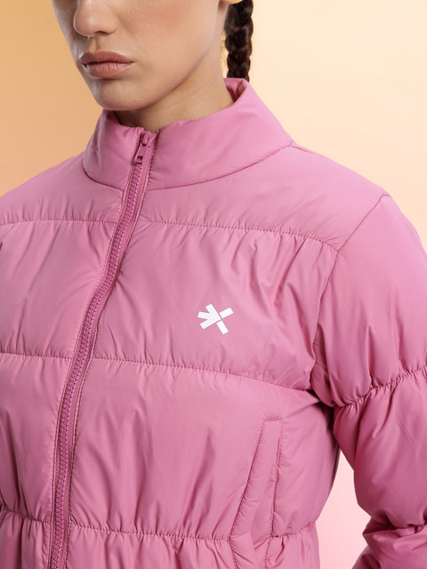 Pink solid puffer jacket, has a mock collar, 2 pockets ,has a zip closure, long sleeves, straight hemline, without lining