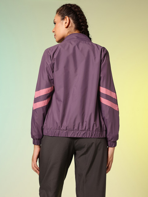 Purple and pink striped tailored jacket, has a mock collar, 2 pockets, has a zip closure, long sleeves, straight hemline, polyester lining