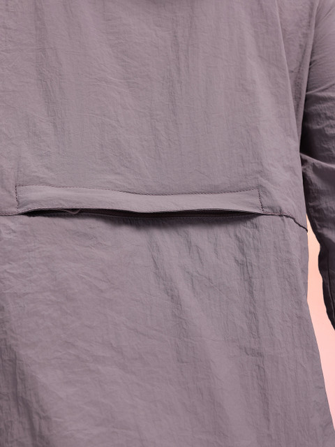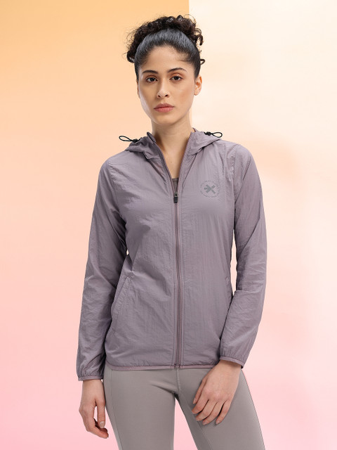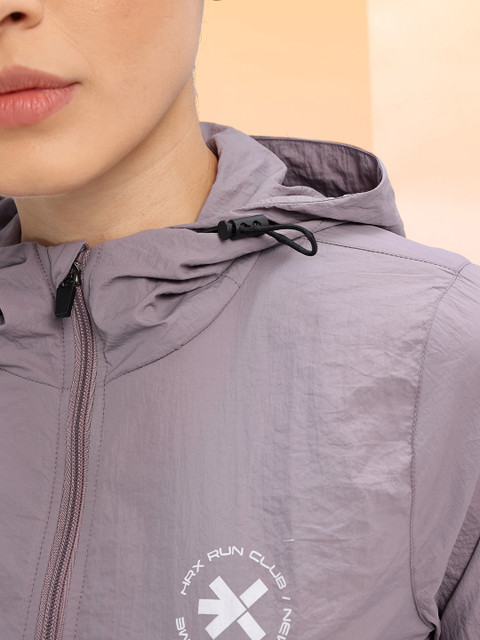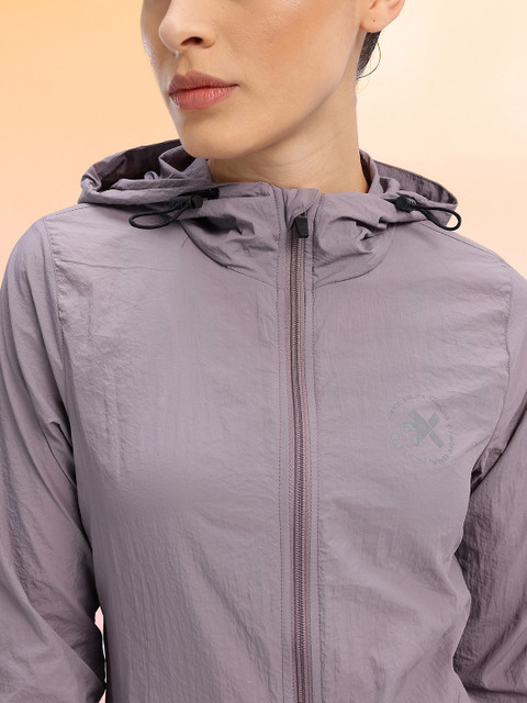 Purple solid reflective strip sporty jacket with utility pockets, has a hood, 3 pockets, has a zip closure, long sleeves, straight hemline, without lining