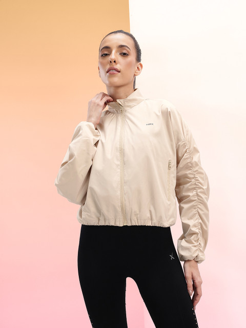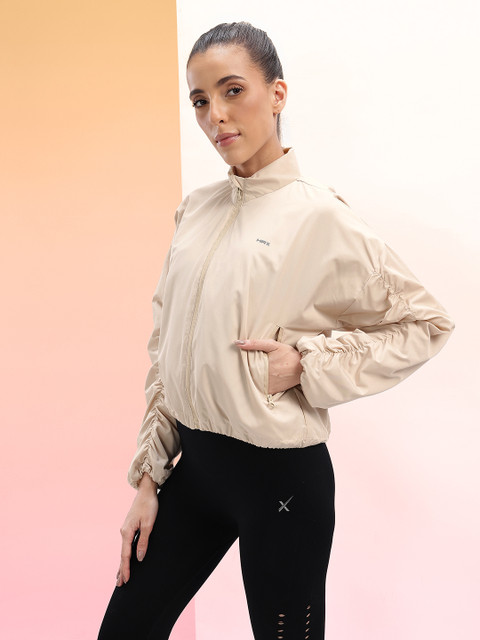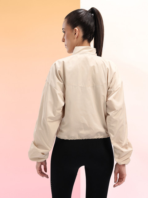 Beige solid running jacket, has a mock collar, 2 pockets, has a zip closure, long sleeves, straight hemline, polyester lining, reflective brand logo, ruching on sleeves