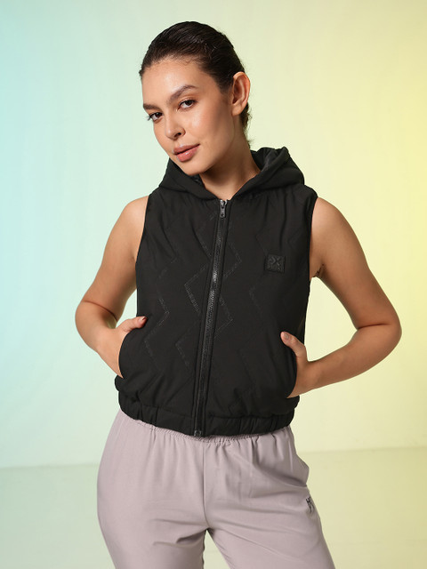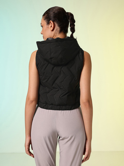 Black solid puffer jacket, has a hooded, 2 pockets, has a zip closure, sleeveless, straight hemline, without lining