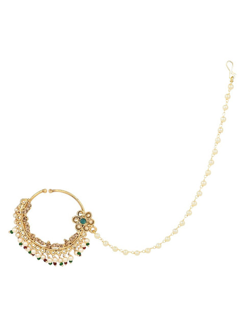 Gold-plated crystal-studded nose pin with textured detail, has a pearl beaded chain extension
