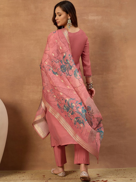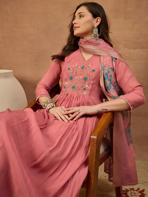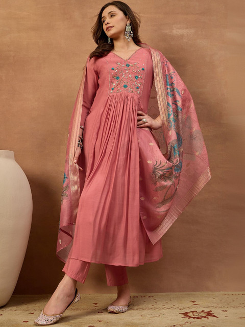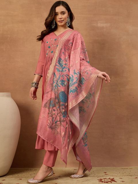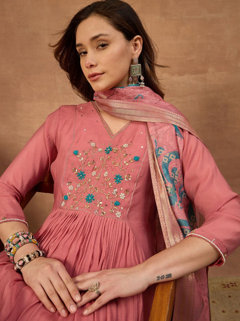 TOP: Mul Chanderi, TOP INNER: Mul Cotton, BOTTOM: Cotton, DUPATTA: Jacquared Silk Blend, Dry Clean