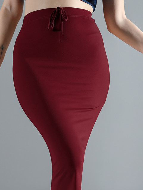 Maroon solid saree shapewear, has an elasticated waistband with inner drawstring closure, seamless and a side slit