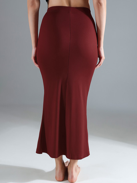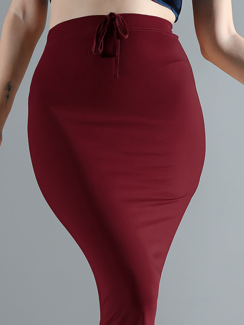 Maroon solid saree shapewear, has an elasticated waistband with inner drawstring closure, seamless and a side slit