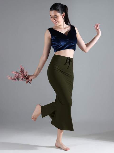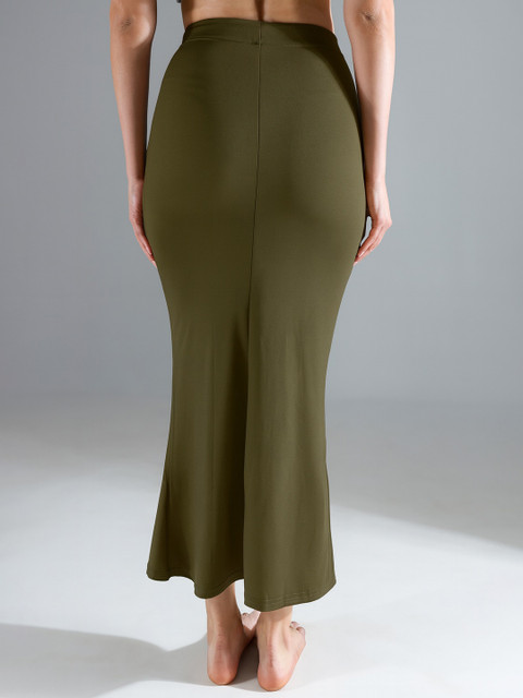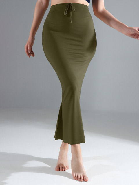 Olive solid saree shapewear, has an elasticated waistband with inner drawstring closure, seamless and a side slit