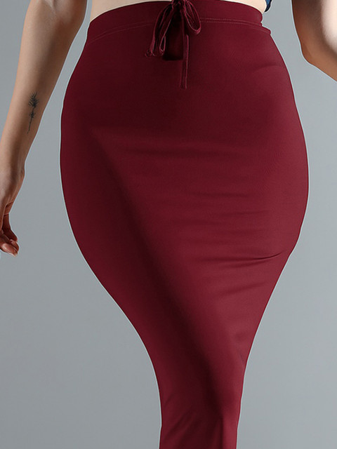 Maroon solid saree shapewear, has an elasticated waistband with inner drawstring closure, seamless and a side slit